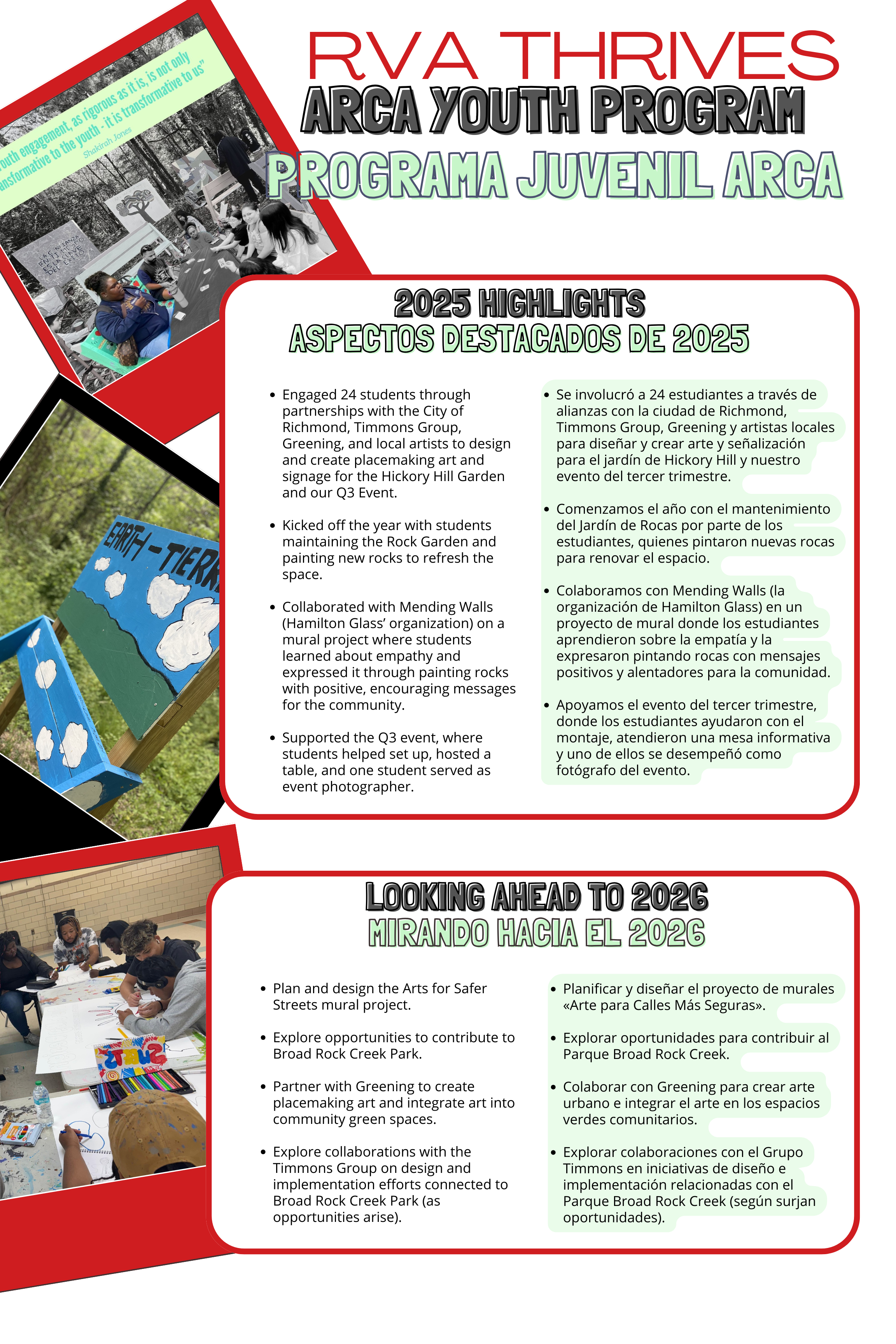 En 2023, a nosotros (el personal de VACV, los codirectores de ARCA y los jóvenes) se nos ocurrió la idea de crear un jardín de rocas en Broad Rock Creek Park como su proyecto para el año porque querían tener algo que la gente pudiera sentir que podían añadir al parque. Tras debatirlo, decidimos pintar los colores del jardín de rocas basándonos en los elementos de una rueda de la medicina (una rueda de la medicina es un símbolo de la interconexión de todas las cosas y representa los cuatro elementos de la naturaleza) e incluimos mensajes positivos de los jóvenes en algunas de las rocas del jardín.