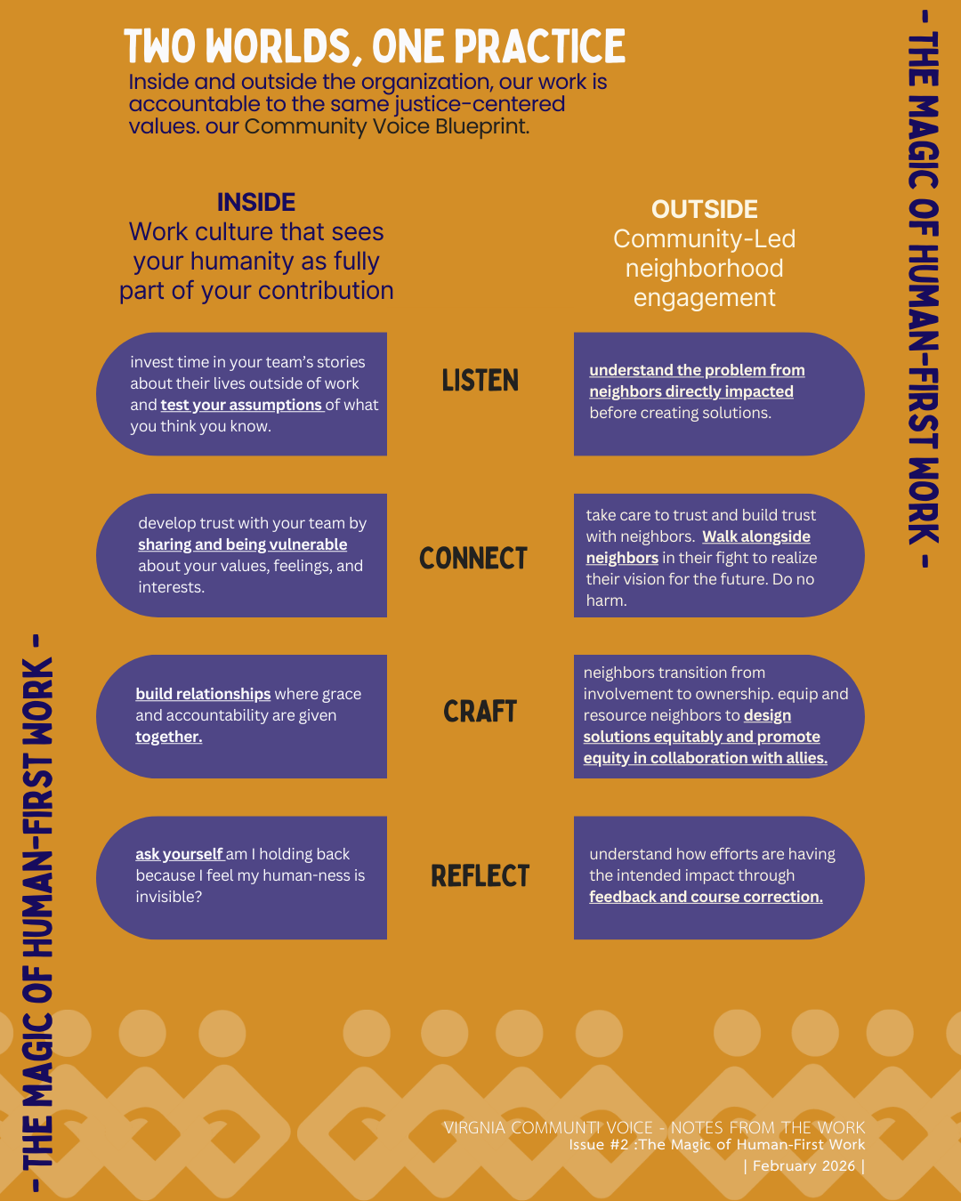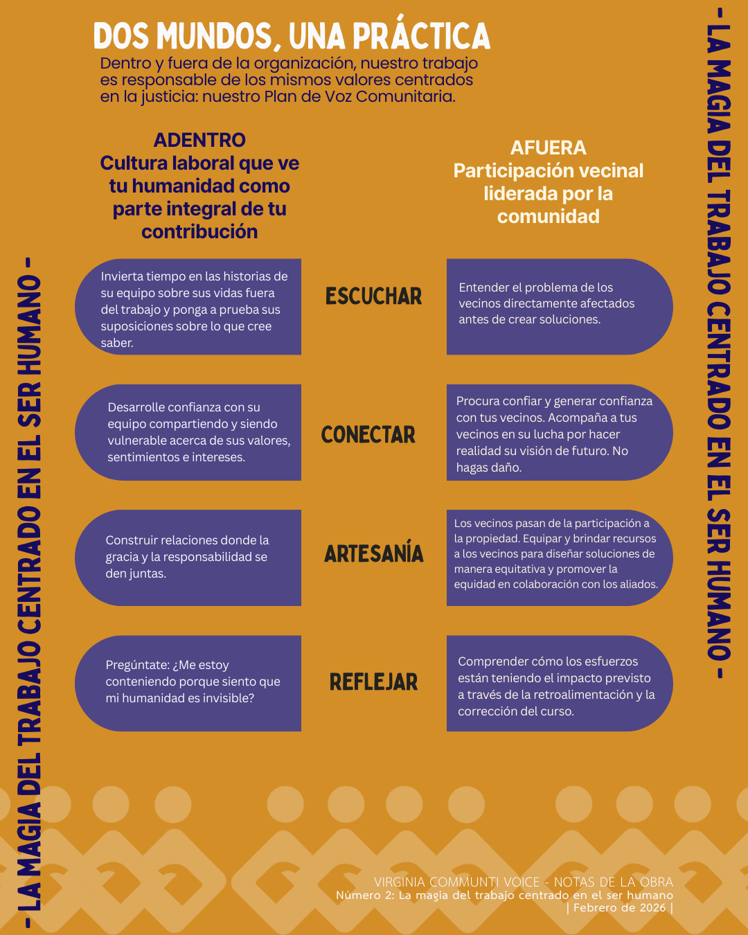 Practicamos esto dentro de nuestra organización porque la forma en que nos tratamos unos a otros ya es en sí misma una labor de justicia. Y lo practicamos fuera porque las comunidades merecen instituciones que estén alineadas, rindan cuentas y pongan en práctica el mundo que están tratando de construir.